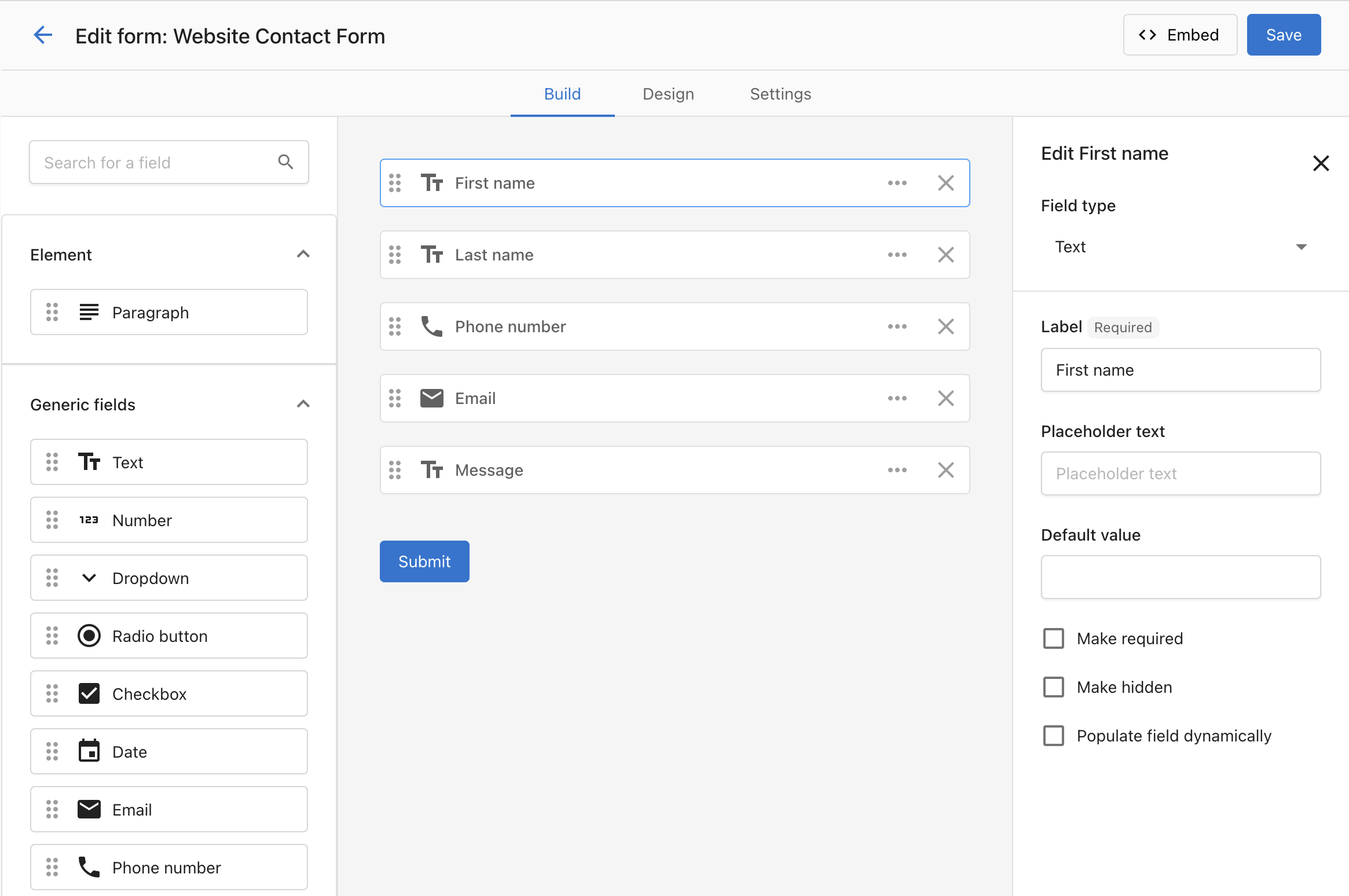 Add the key fields you’d like to capture. Keep forms short—conversion rates drop as fields increase.