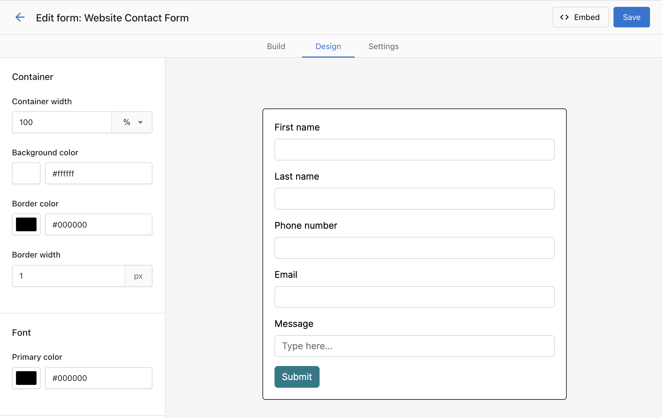 You may want to set the form width to 100%, and then manage the width using your page builder. In the “Design” tab, style the container, font, and button.