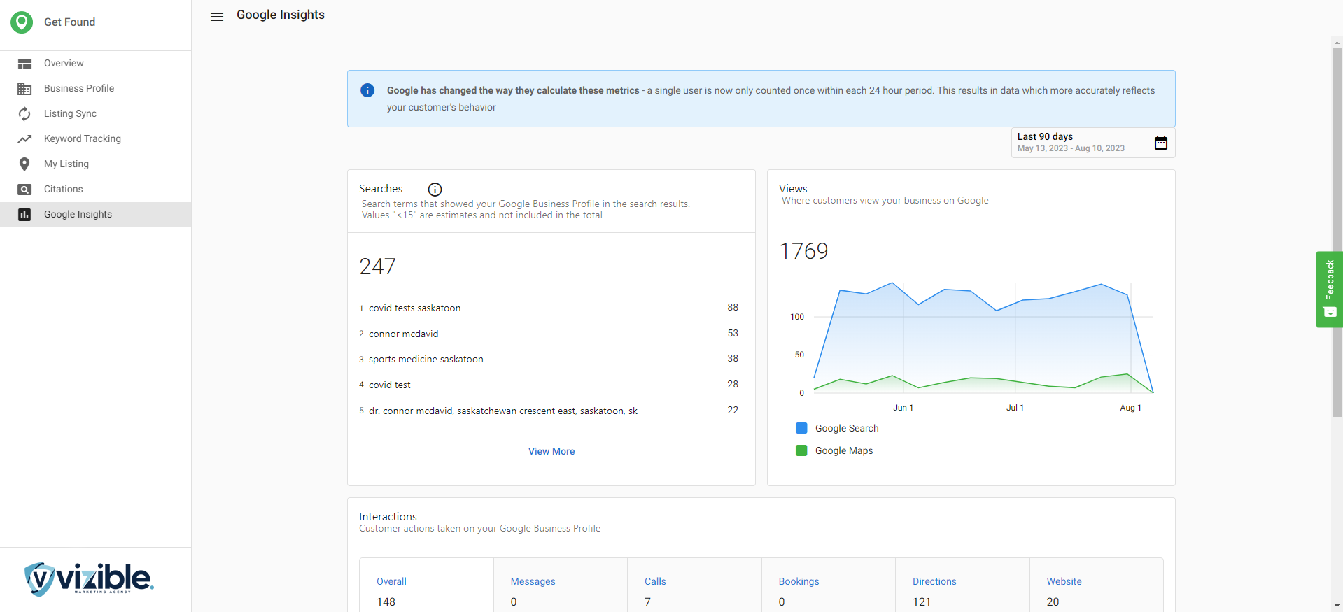 After connecting, you can view metrics such as searches, where customers view your business, and common customer actions.