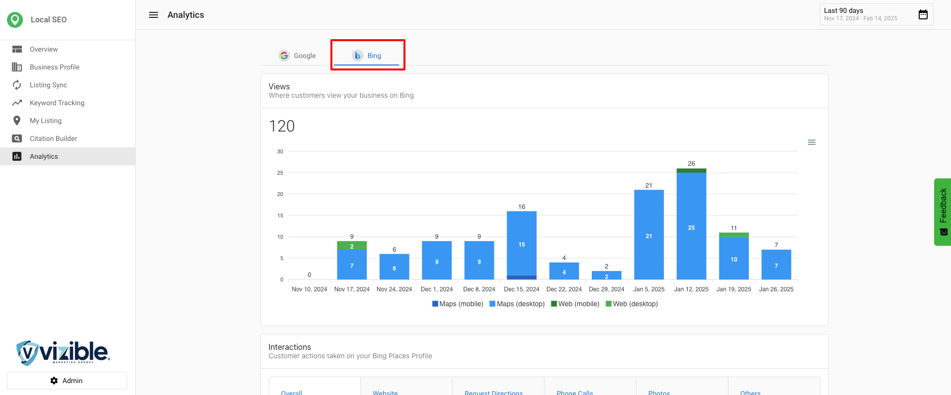 Bing Insights allow Local SEO Pro users to see how their business listings perform on Bing. This feature enhances visibility into search traffic and customer interactions beyond Google.