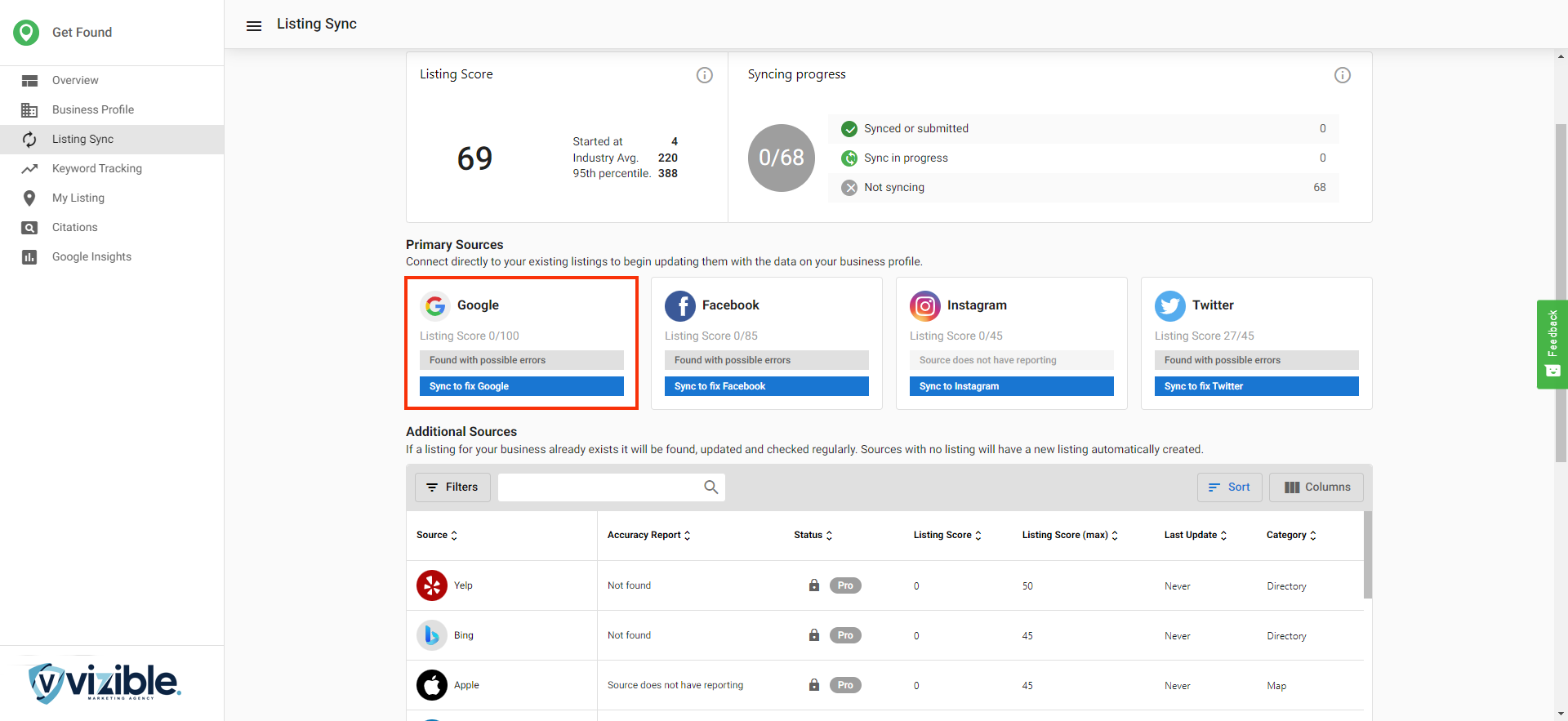 2. Click Sync to fix Google on the Google listing source.