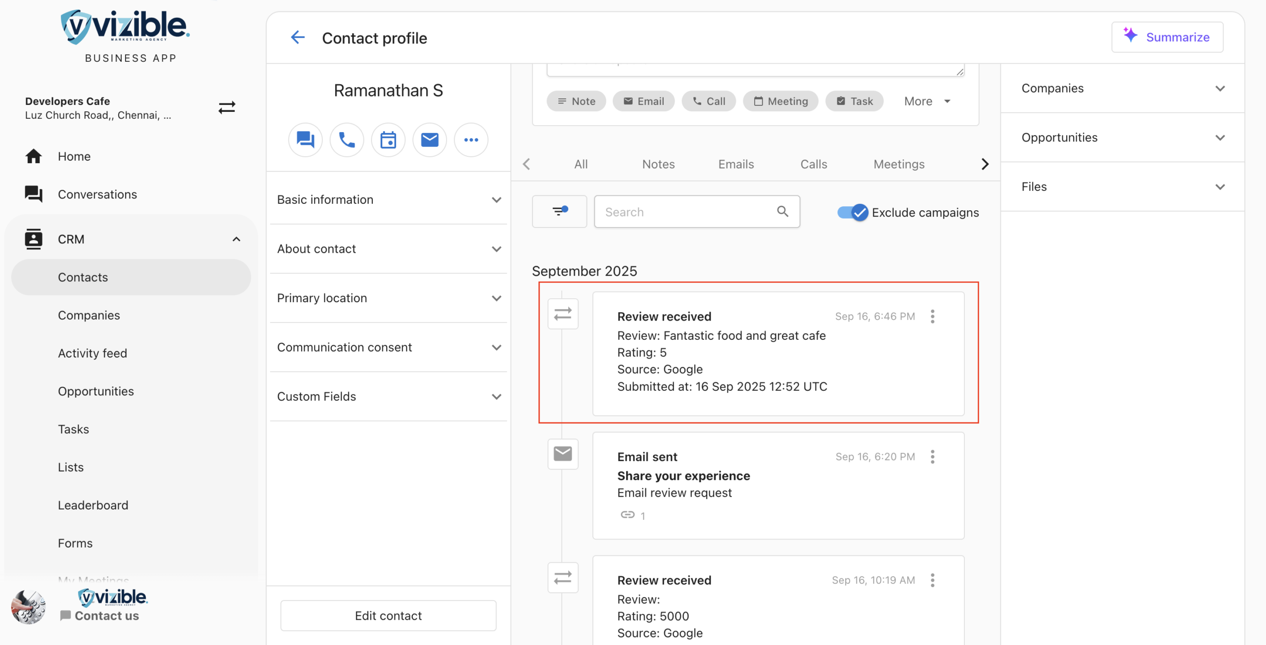 In a matched contact’s timeline, the Review Card includes: