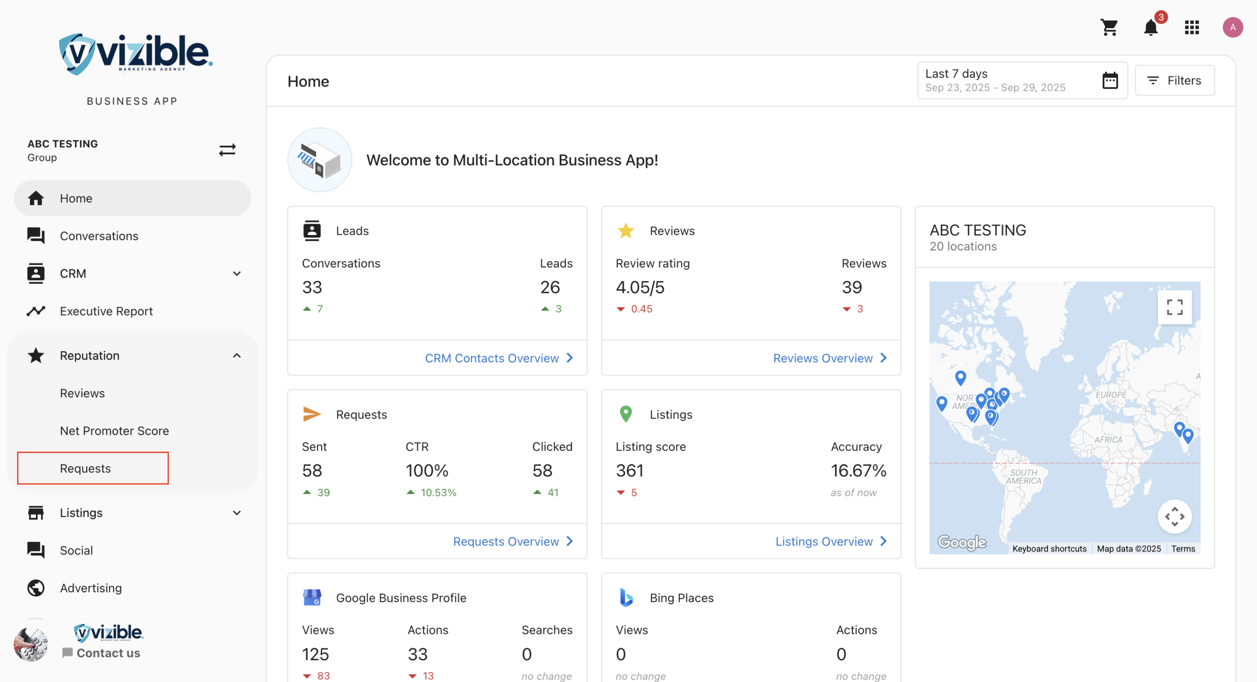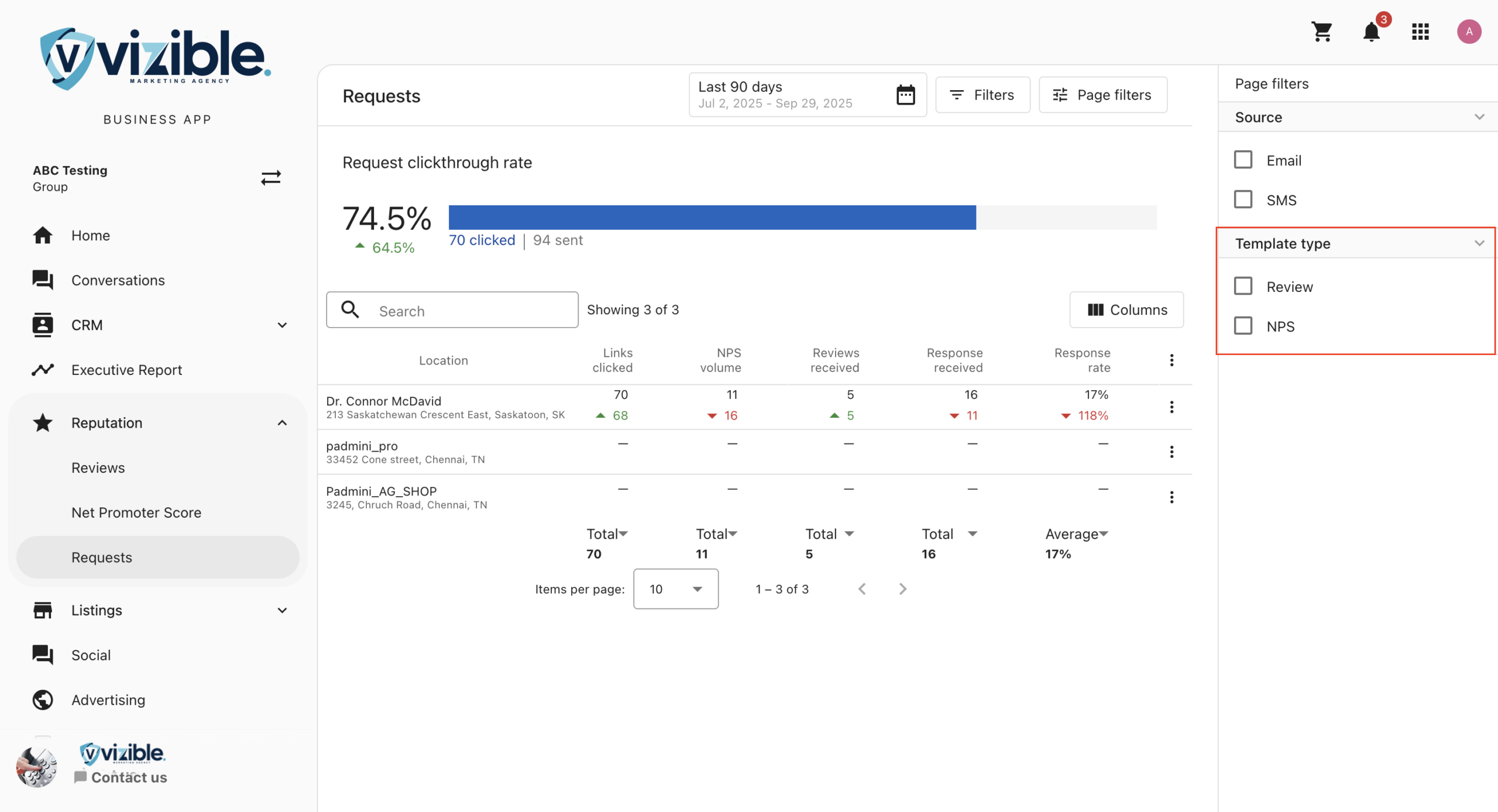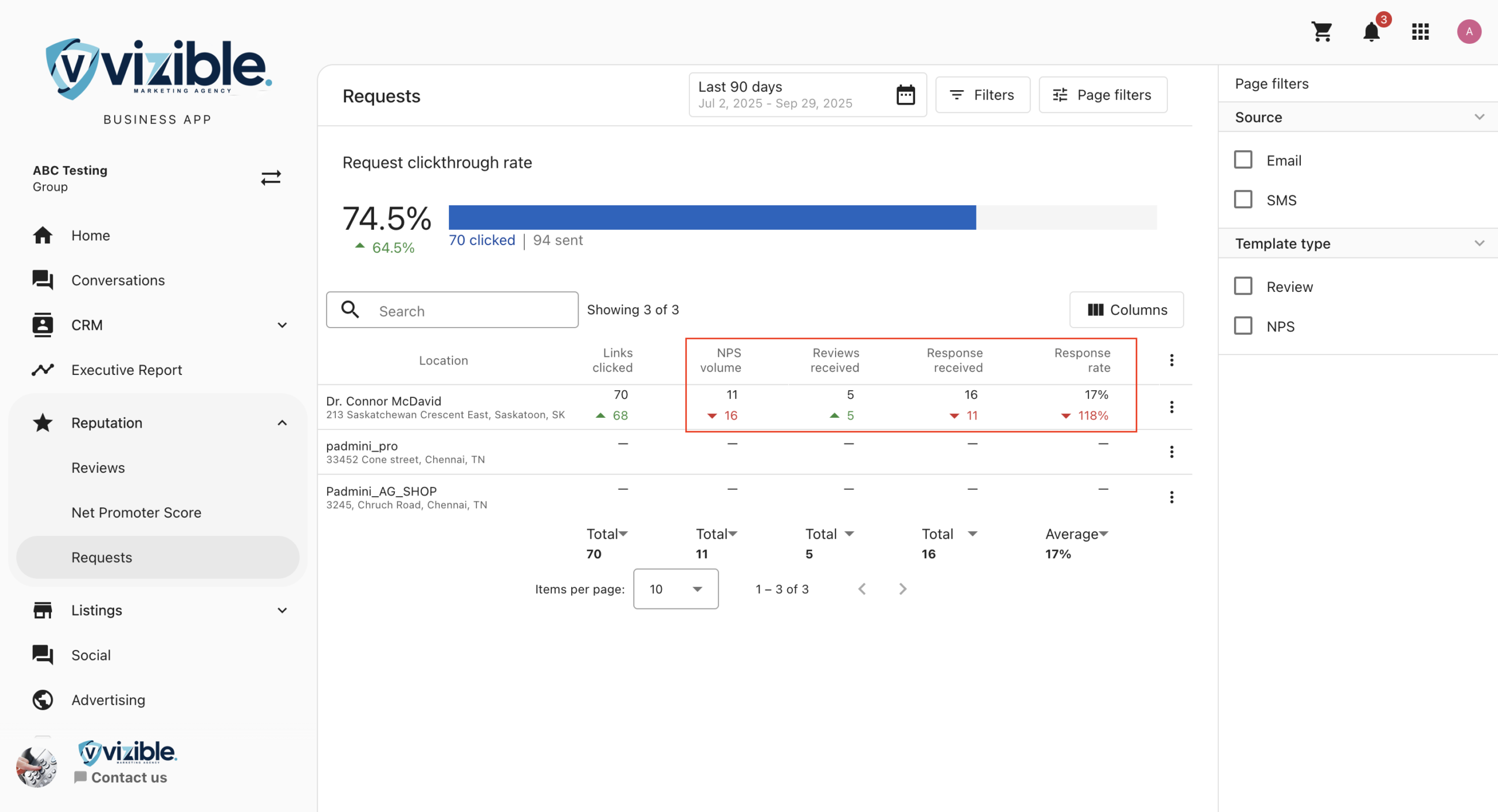 In the side menu, select Reputation, then go to the Requests tab. This view shows review request activity across locations. Review Matching is also applied here.